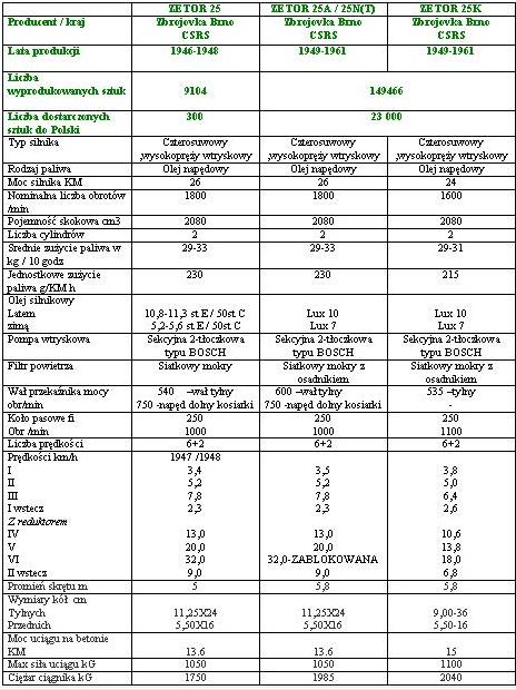 Pierwsze ciągniki Zetor 25 trafiły do naszego kraju już w 1948 roku a więc rok po uruchomieniu ich produkcji w dawnej fabryce zbrojeniowej „ Zbrojovka Brno” w Czechosłowacji . Traktor Zetor 25 charakteryzował się dość solidną i nieskomplikowaną budową ale i pod względem rozwiązań technicznych nie ustępował innym konstrukcjom ciągników. Posiadał dwucylindrowy silnik wysokoprężny o mocy 26 KM przy 1800 obr/min sprzężony z 8 biegową skrzynią przekładniową.