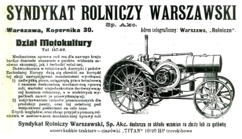 W 1920 roku Syndykat Rolniczy w Warszawie sprowadził i uruchomił na majątkach ziemskich pierwszych 250 amerykańskich traktorów Titan 10/20 i 1 cylindrowych „Junior 8/16”. Bardzo tanie traktory w cenach nie przekraczających dziewięćset dolarów okazały się szlagierem importowym.